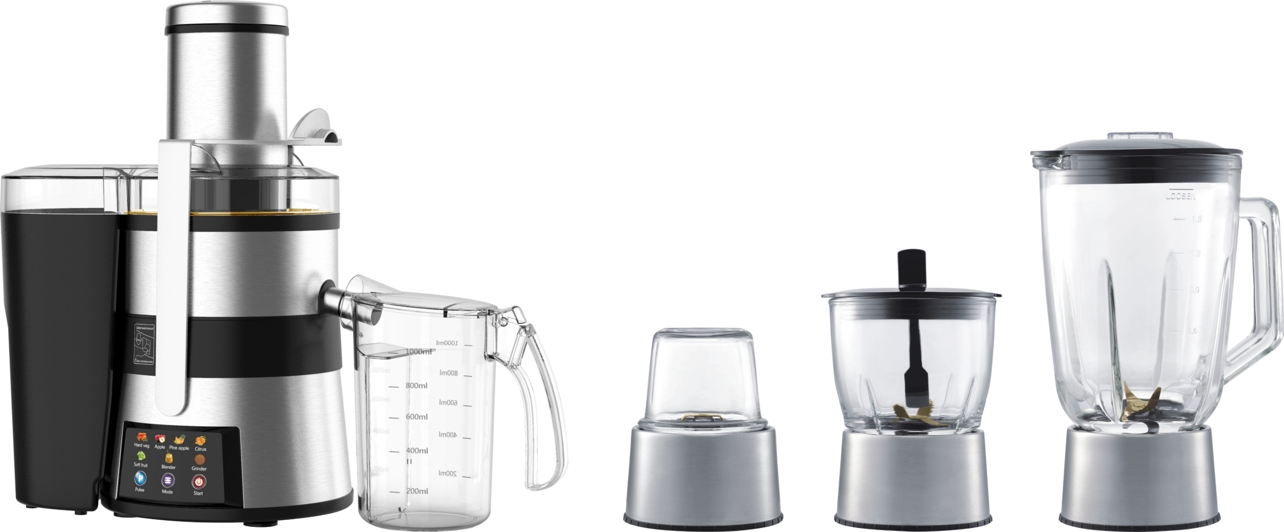 آبمیوه گیری 4 کاره دیجیتال با نمایشگر رنگی TFT لمسی، 800وات، دارای پارچ مخلوط کن و خردکن و آسیاب پیرکس با پایه استیل، تیغه های تیتانیومی، 5سرعت، دارای کلید توربو، سیستم ضدچکه